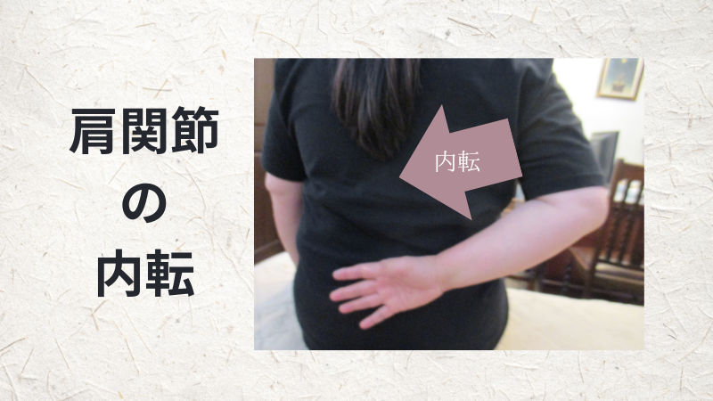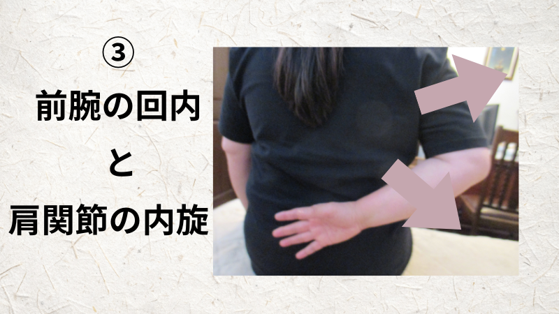 ③上腕を後ろに伸ばしたポジションから、前腕を内側に、親指の方向に、ねじって(回内)もらいます。すると、おのずから、上腕も内側にねじれ(内旋)ます。