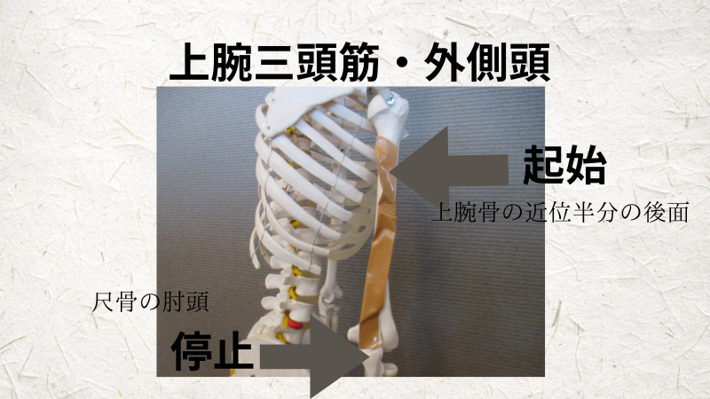 上腕三頭筋の外側頭は、、上腕骨の近位半分の後面から始まり、尺骨の肘頭に終わります。