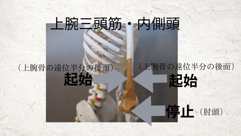 上腕三頭筋の内側頭は、上腕骨の遠位半分の後面から始まり、尺骨の肘頭に終わります。