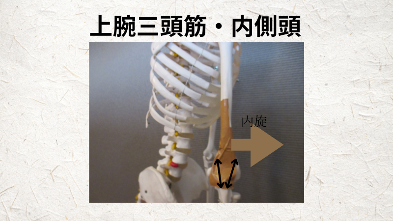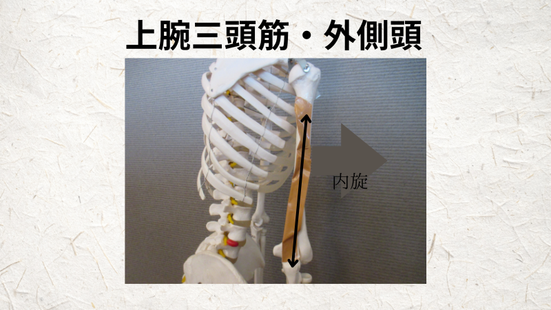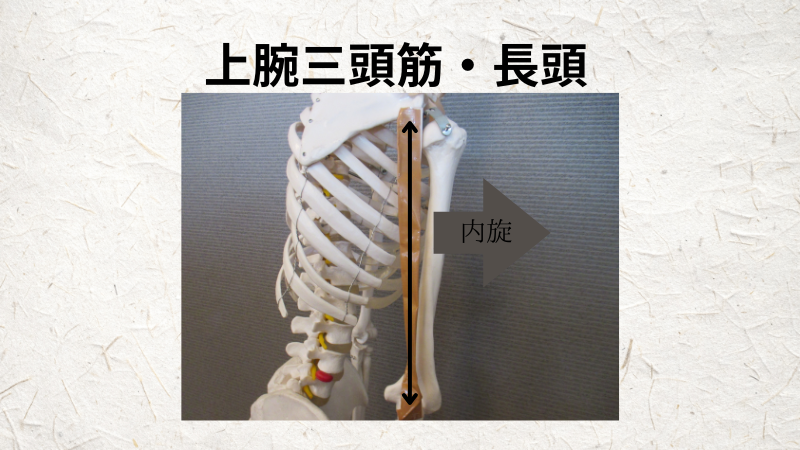 上腕三頭筋群の筋肉の長さに注目しながら、上腕三頭筋を内旋、内側にねじると、筋肉の長さがどのように変化するかを観察してみます。