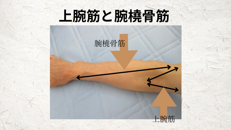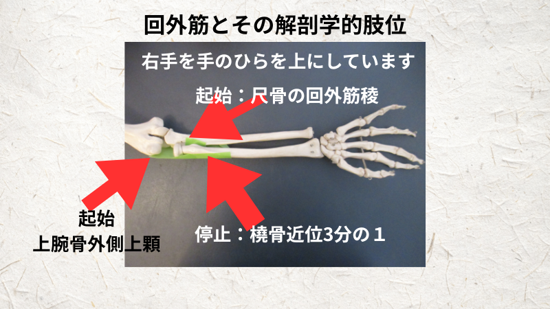 回外筋は前腕の外側の大きな筋肉である腕橈骨筋の深層に位置しており、橈骨を触れるように触ると、そこに付着している筋肉が回外筋です。