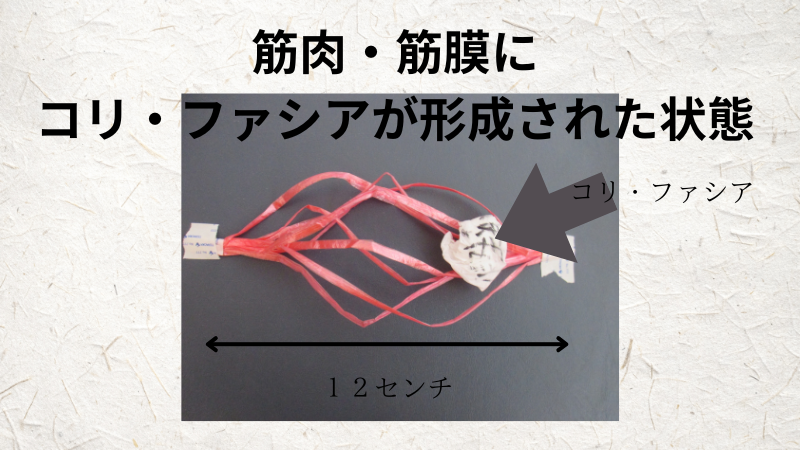 「コリ・ファシア」が形成されると、正常であれば15センチまで伸びることができた筋肉が、筋肉が硬化したために12センチまでしか伸びなくなりました。