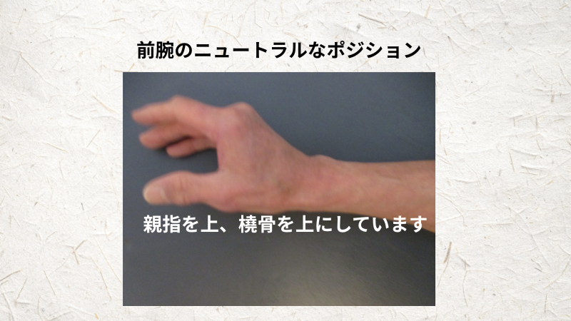親指から橈骨を上にした状態、このポジションが前腕のニュートラルな状態です。